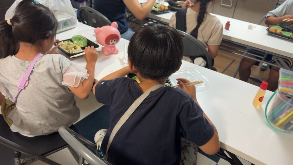 お弁当の配布。その場で食べる子、持ち帰る子、それぞれに声をかけます。